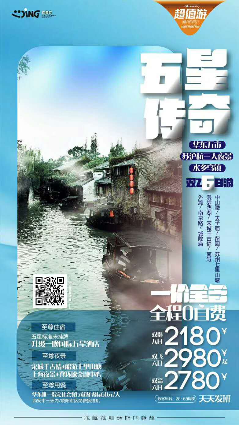 住宿:全程五星级酒店住宿(不挂牌)苏州升级一晚网评七星或温泉酒店,全程不提供自然单间及三人间,如酒店可加床,加床为钢丝床,产生单房差由游客自行承担750元/人;