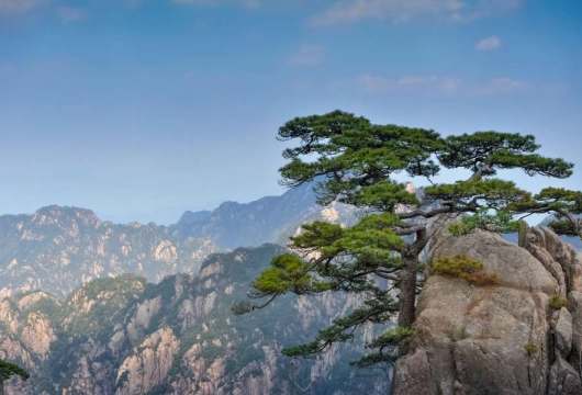 往玉屏楼观景区(视体力情况而定),途径鳌鱼峰、百步云梯、孔雀戏莲花等景点后,观黄山十大名松的---迎客松、